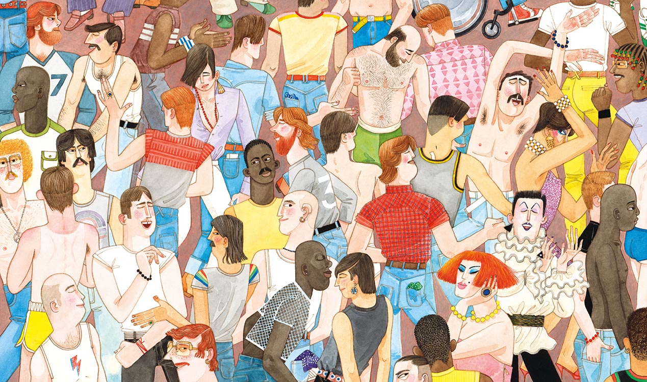 'The piece was made for a book called, We Are Your Children - A History of LGBTQ+ Activism, published in May 2025. It's watercolour, ink and coloured pencil on hot-pressed 300g paper. It's for a part of the book about the beginning of the 1980s, after certain freedoms had been hard fought for and won. It's an imagined scene of what queer joy may have looked like before the AIDS epidemic.'