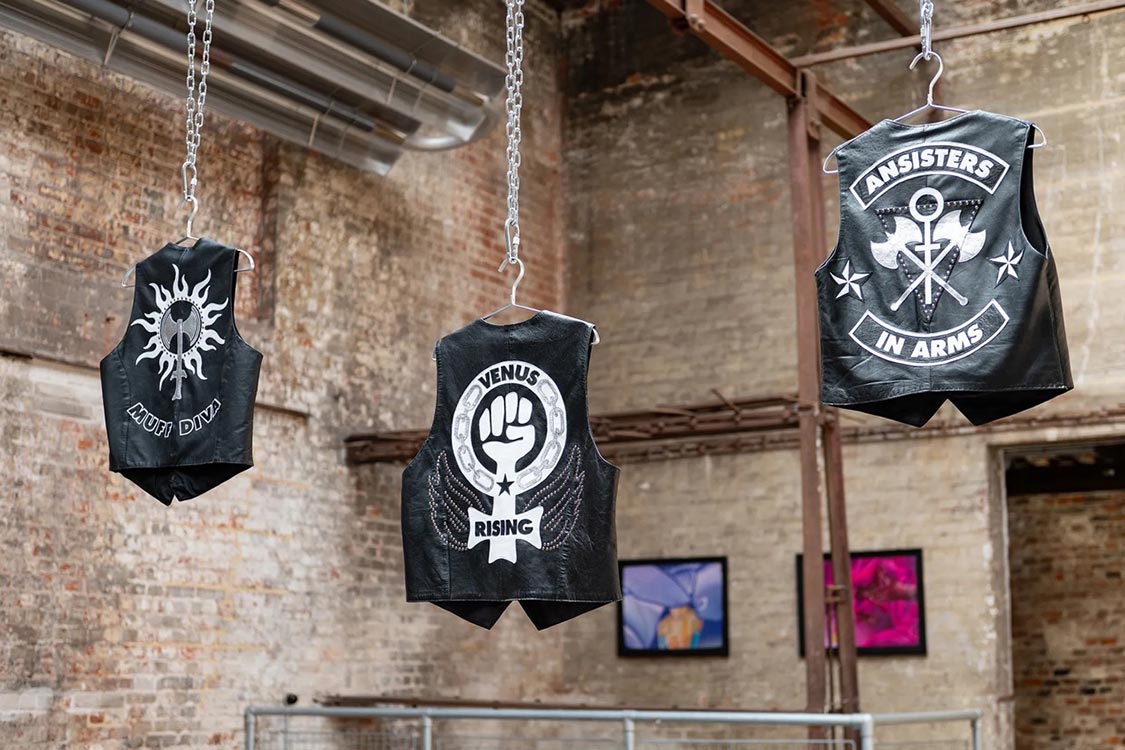 'This installation piece is about dyke history as well as dyke futures. Connecting queer women throughout time by referencing lesbian vernacular, shared secret visual languages and inherited cultural touchstones. Influenced by the legacy of the London lesbian leather scene, the Black Widows, a 1980s London dyke motorcycle gang, and Dykes on Bikes, I am reimagining modern lesbian heraldry inspired by archival materials and recorded sapphic stories from the Bishopsgate Institute LGBTQ+ archives.'
